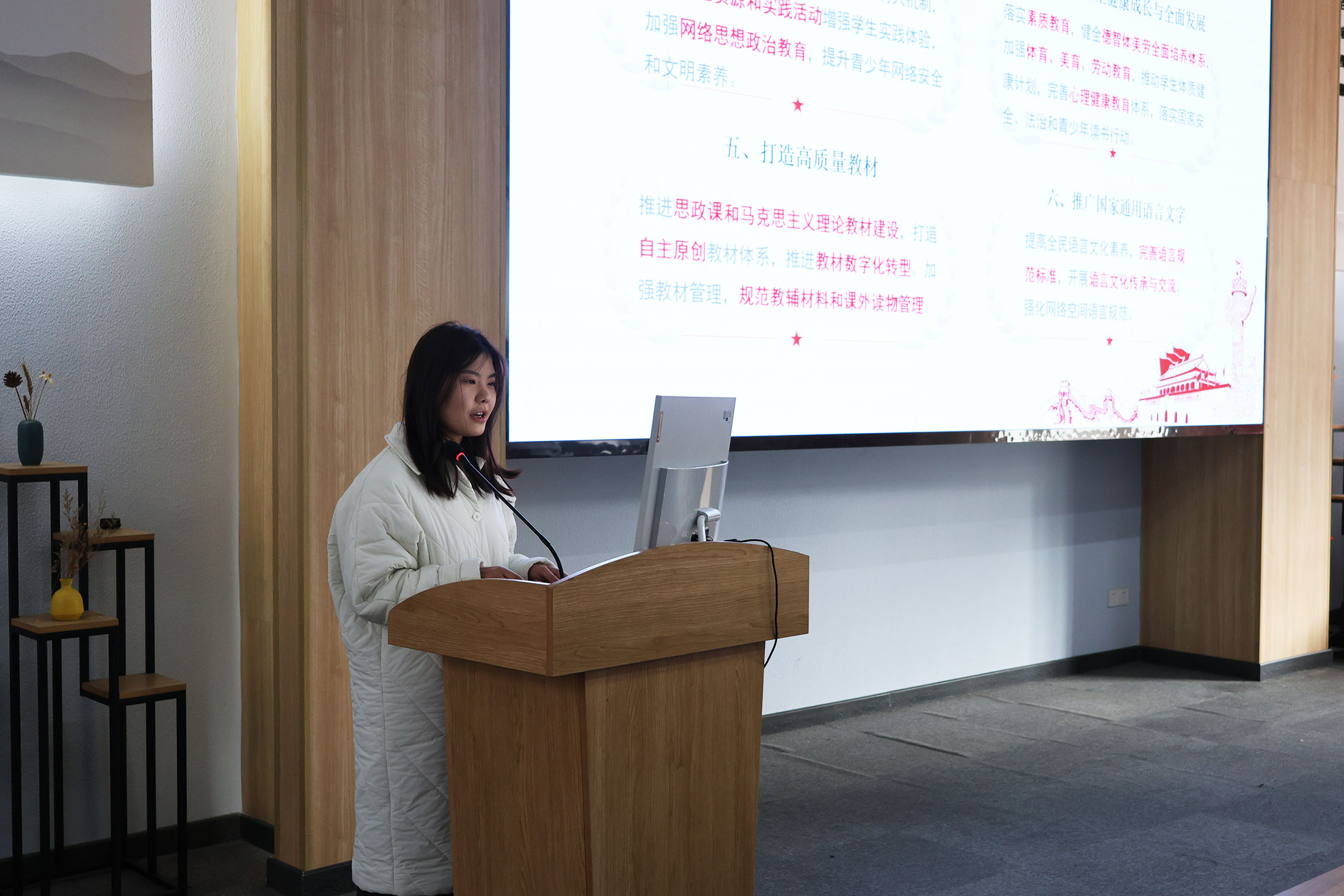 随后,党支部组织委员耿明月带领全体同志进行了《教育强国建设规划纲要(2024-2035 年)》的理论学习。她对纲要的总体要求、塑造立德树人新格局、办强办优基础教育、增强高等教育综合实力、培育壮大国家战略科技力量、加快建设现代职业教育体系、建设学习型社会等内容进行了领学,使支部党员对教育强国建设的重要意义和具体要求有了更深入的理解。